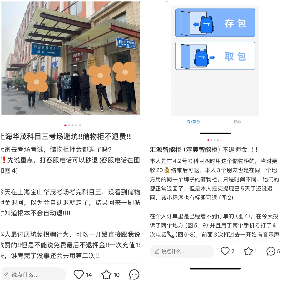 4月初,小李(化名)就在社交平台分享了自己使用寄存柜的经历:“在驾校考试用寄存柜存放了手机,用完后押金竟不给退。”帖文下方,不少人直呼有同感,还现身说法为小李提供“退押金”的攻略。